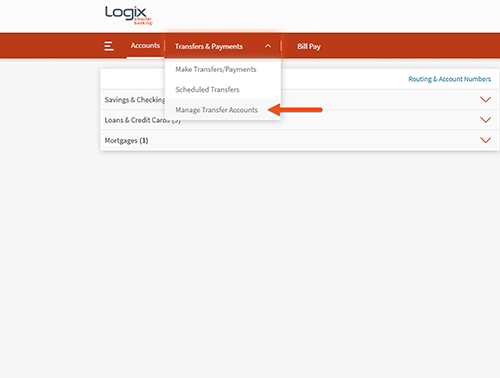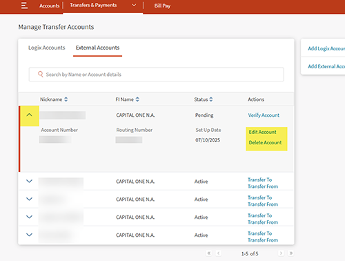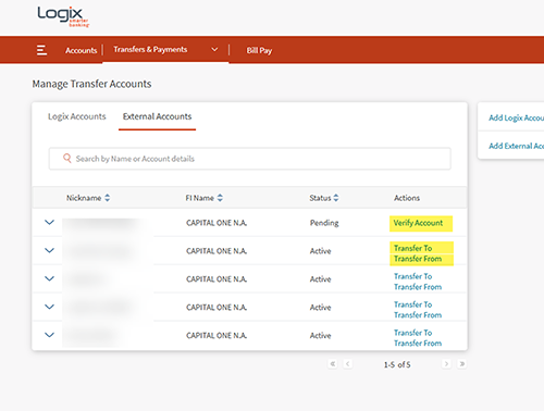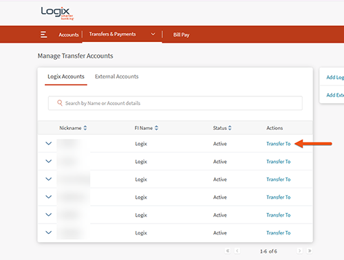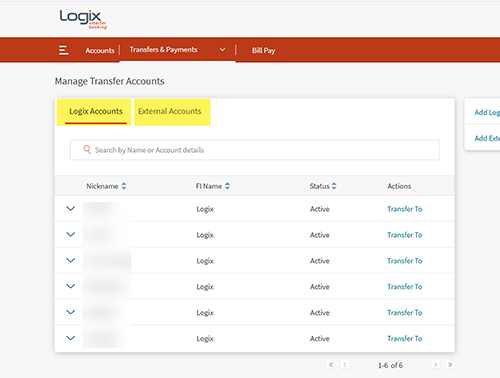Click on the desired tab at the top to access either “Logix Accounts” or “External Accounts”.